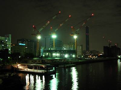 この予定地を看板の横から晴海埠頭方面に向かって見たのがこの写真です。遠くにレインボーブリッジのライトが見えます。その中央にピラミッドのような、大きな十字架のお墓のような、ピカピカした建物があります。それが、今晩の目的地である晴海客船ターミナルです。