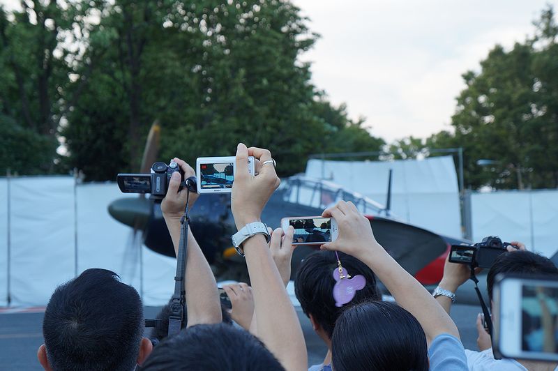退出時に席の前に行って零戦の姿だけをカメラに収めた・・・つもりが他の人が写ってました。招待席にいる人たちだけはこうして至近距離で記念撮影させてもらえてたのですよね。かなり多くの方が招待されていましたが、どういう人たちなのでしょう。うらやましい限りです。