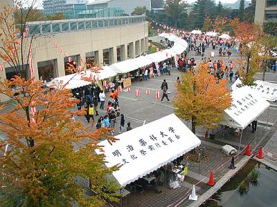 写真に写っている表通りは食べ物を扱う屋台が並んでいます。もちろんここでお祭り気分を味わうのも楽しいのですが、講義棟で行われている真面目なパネル展示も私は好きです。説明してくださる学生さんはみなよく勉強されていて、安心します。私が真面目に勉強しない学生だったからかもしれません。